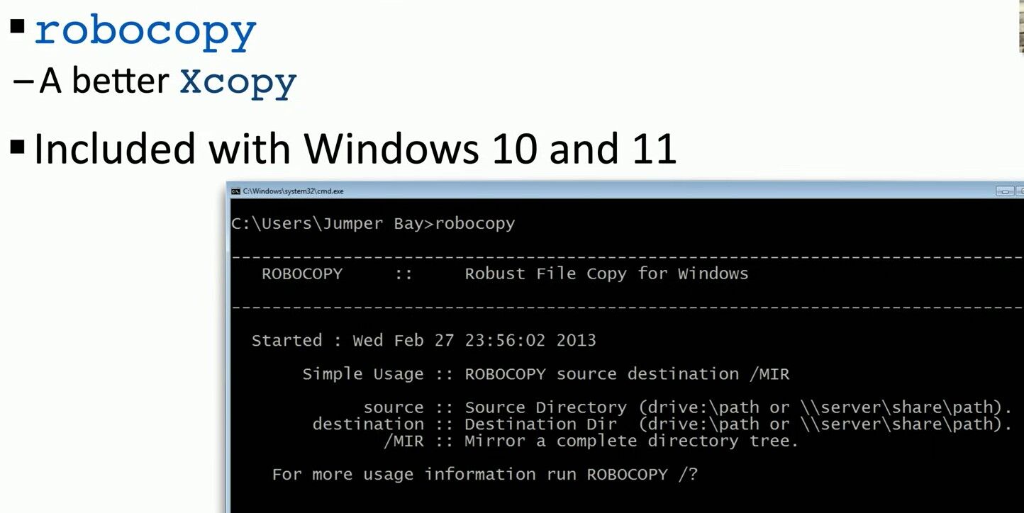 This summary provides an overview of why robocopy is a better alternative to xcopy, how to use it to create a mirror of a directory, and its practical applications for backups and data migrations.