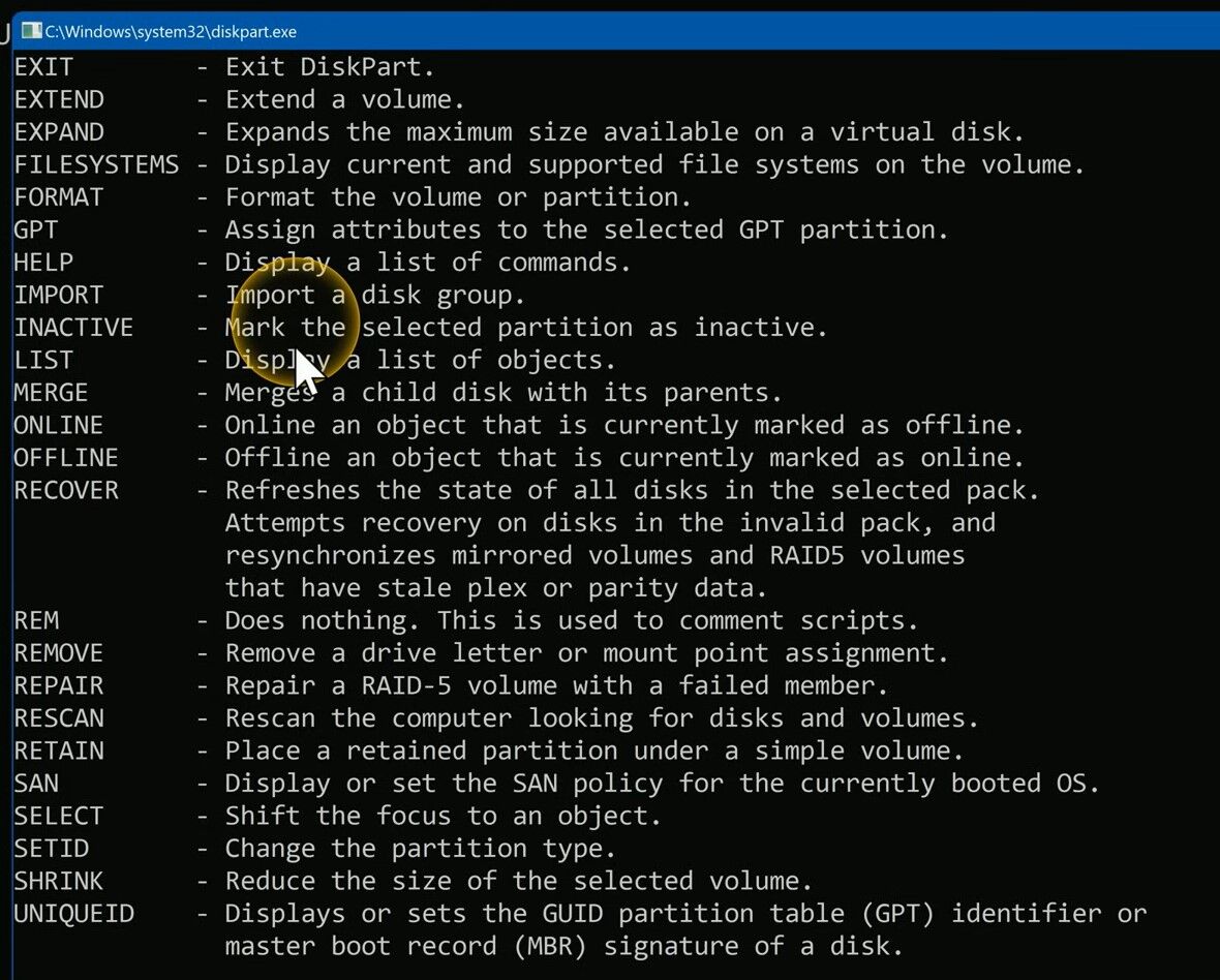 helpand press Enter. You’ll see a list of all commands available within Diskpart.