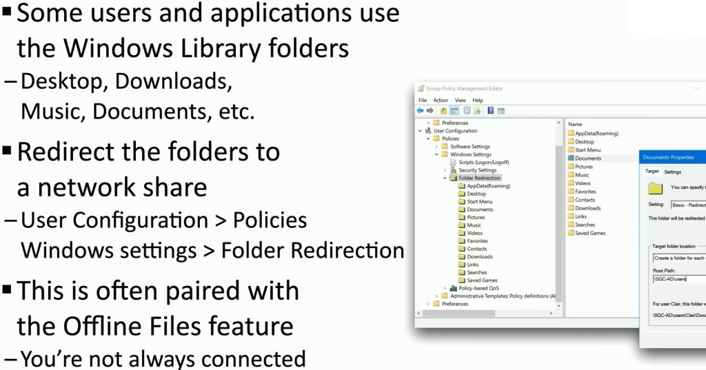 In the “Target” tab, choose “Basic – Redirect everyone’s folder to the same location.”Set the target folder location as a network share (e.g.,\\ServerName\SharedFolder\%USERNAME%). - Enable Offline Files: