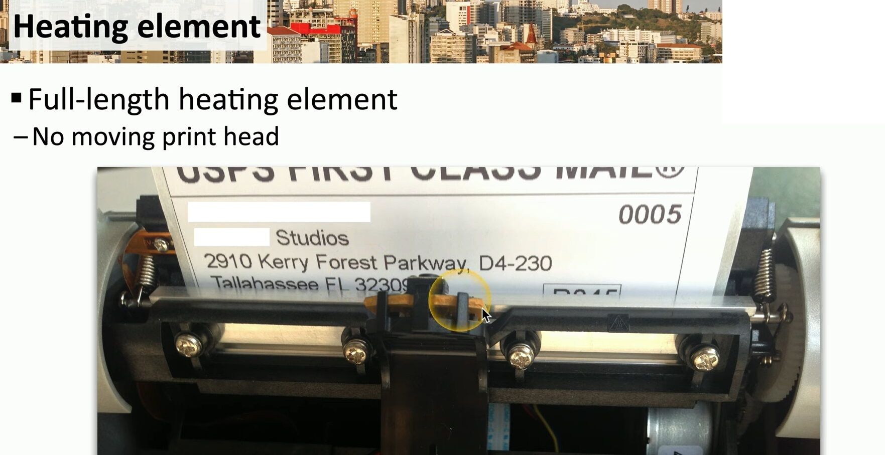 A crucial characteristic mentioned in the image is “Full-length heating element” and “No moving print head.”