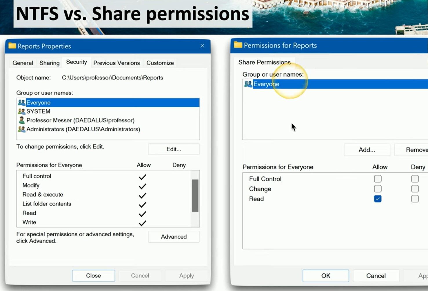 On the left, the NTFS permissions window allows fine-grained control over who can access and modify files and folders locally, using a list of specific users and groups, such as SYSTEM, Administrators, and Everyone. Each permission, like Full Control, Modify, Read & Execute, and Write, can be enabled or denied independently. These NTFS settings always apply, whether access occurs locally or across the network.