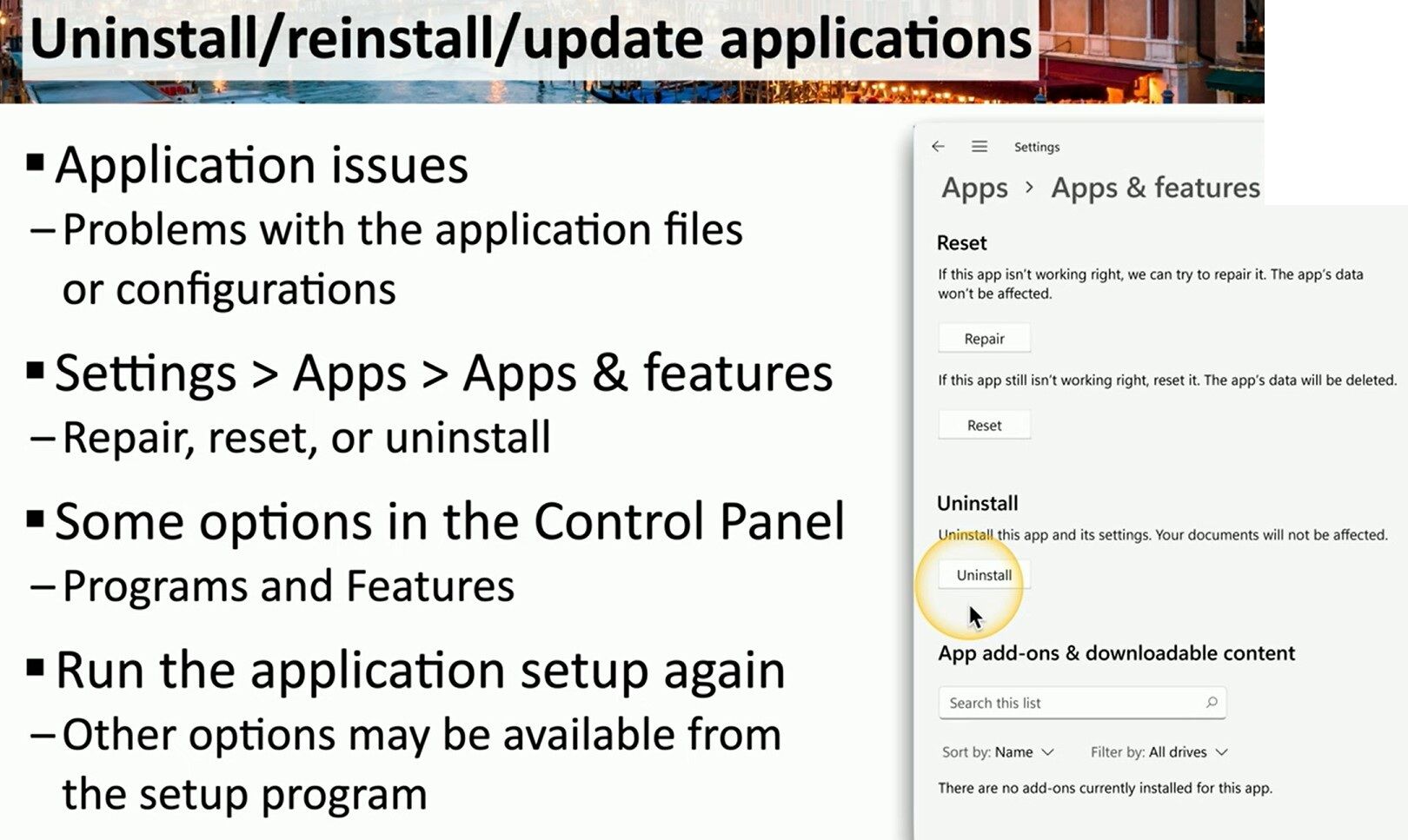 The provided image highlights the essential troubleshooting pathways within the Windows ecosystem. Within Settings > Apps > Apps & Features, Windows offers two distinct recovery options: